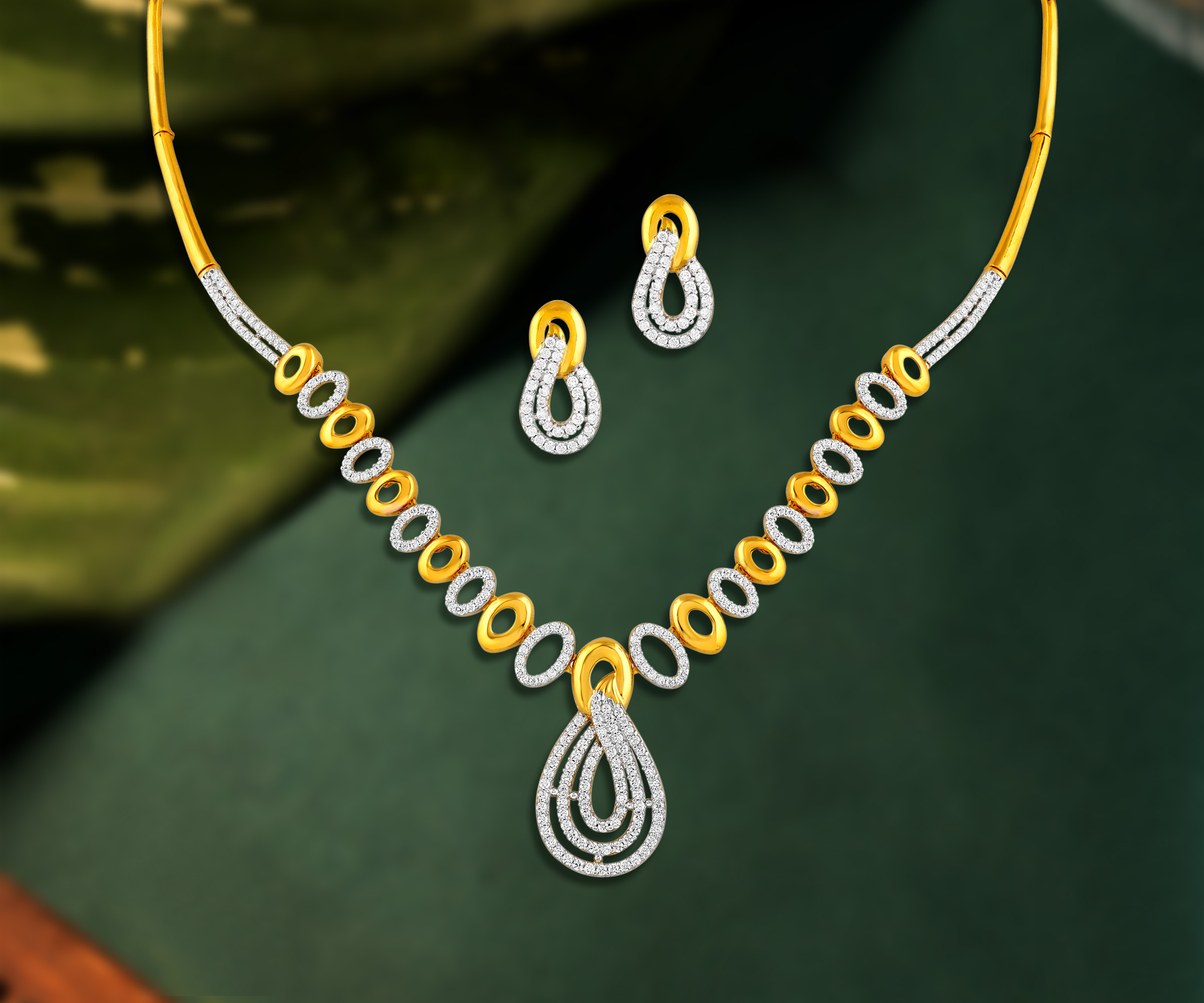 Have a cocktail party or festive celebration to attend? The Teardrop Gold Necklace Set from Aisshpra accented with radiant signity stones is the perfect gold necklace design to elevate your elegant party wear or festive looks.
