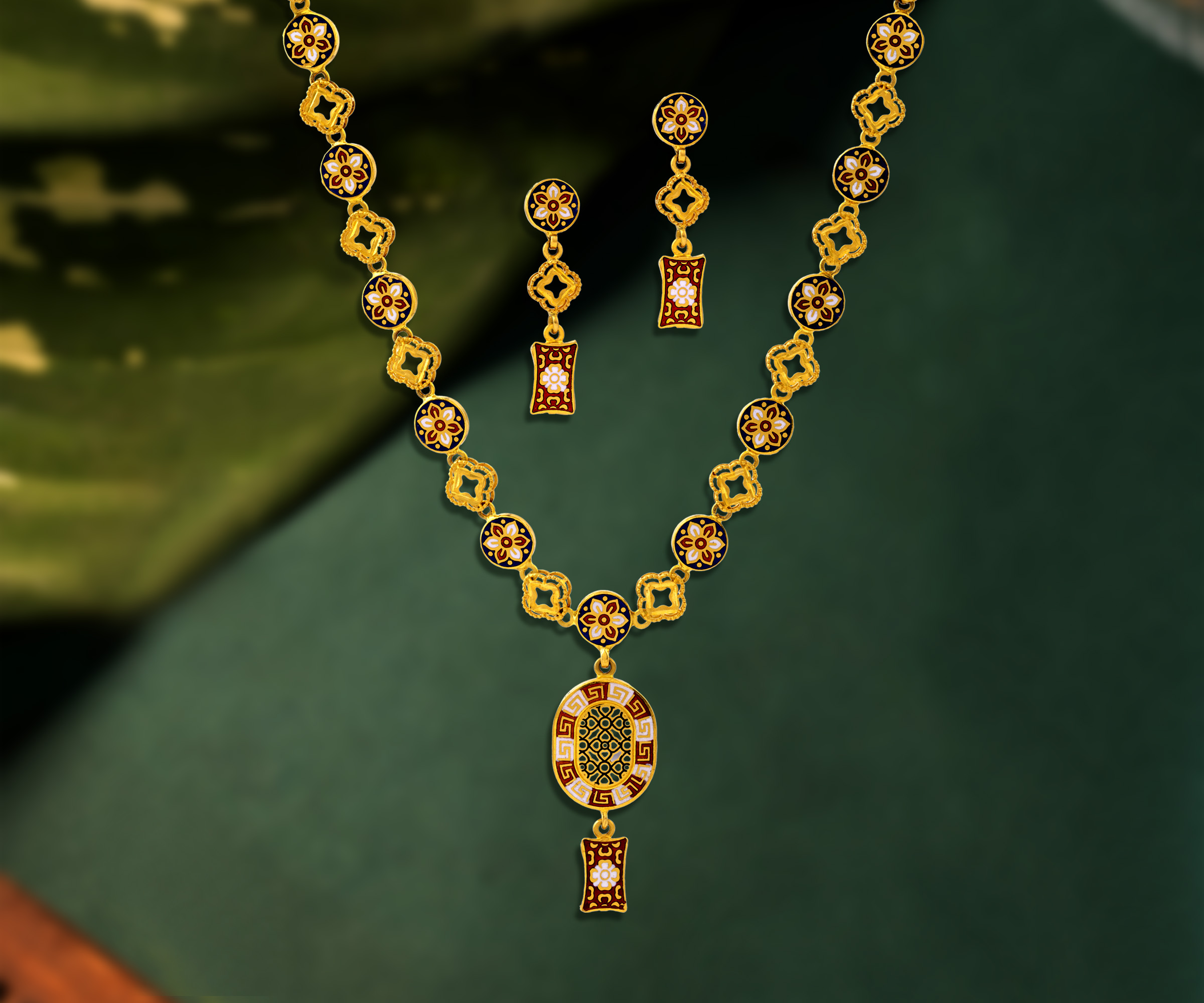 · Traditional Meena Design Gold Necklace: The lightweight gold necklace set from Aisshpra features a striking blend of circular and geometric motifs, adorned with red and black enamel floral patterns.