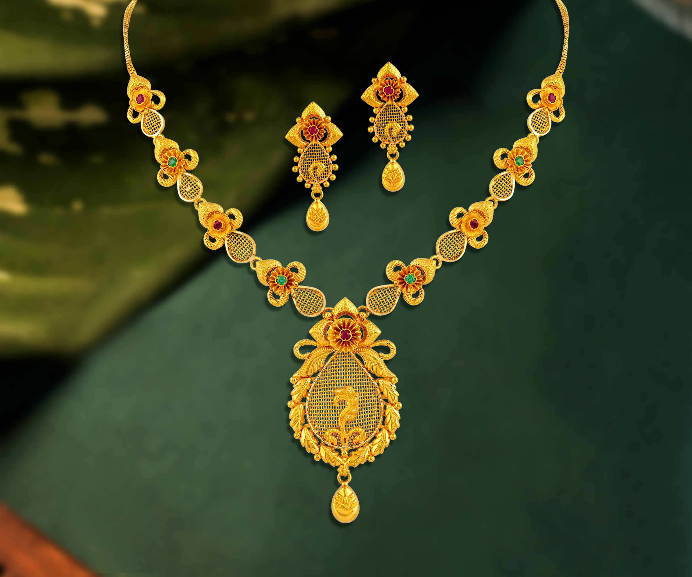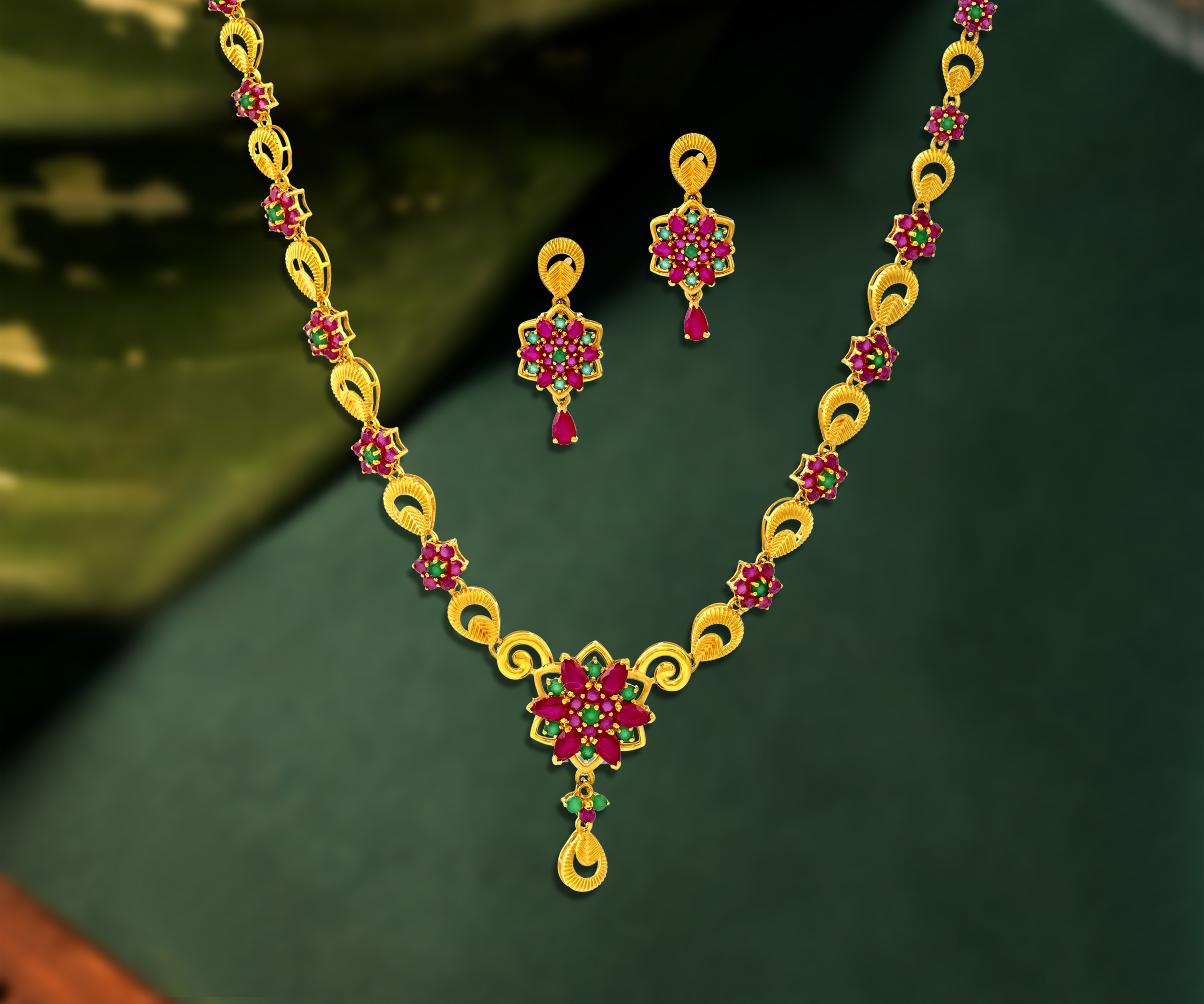 · Radiant Gold Necklace Set Design: The floral inspired gold necklace set from Aisshpra features a symmetrical looped design and vibrant floral motifs embellished with red and green stones.